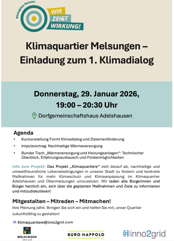 Die Stadt Melsungen plant, sich als eine von maximal 15 hessischen Kommunen für das Beratungsangebot „Klimaquartiere“ zu bewerben. Mit diesem innovativen Programm haben ausgewählte Städte und Gemeinden die Chance, eine dreijährige externe Beratungsleistung zur Sanierung ihrer Bestandsgebiete zu erhalten. Im Fokus stehen dabei Maßnahmen zur Förderung des Klimaschutzes und der Anpassung an den Klimawandel.