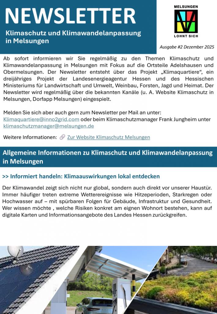 Die Stadt Melsungen plant, sich als eine von maximal 15 hessischen Kommunen für das Beratungsangebot „Klimaquartiere“ zu bewerben. Mit diesem innovativen Programm haben ausgewählte Städte und Gemeinden die Chance, eine dreijährige externe Beratungsleistung zur Sanierung ihrer Bestandsgebiete zu erhalten. Im Fokus stehen dabei Maßnahmen zur Förderung des Klimaschutzes und der Anpassung an den Klimawandel.